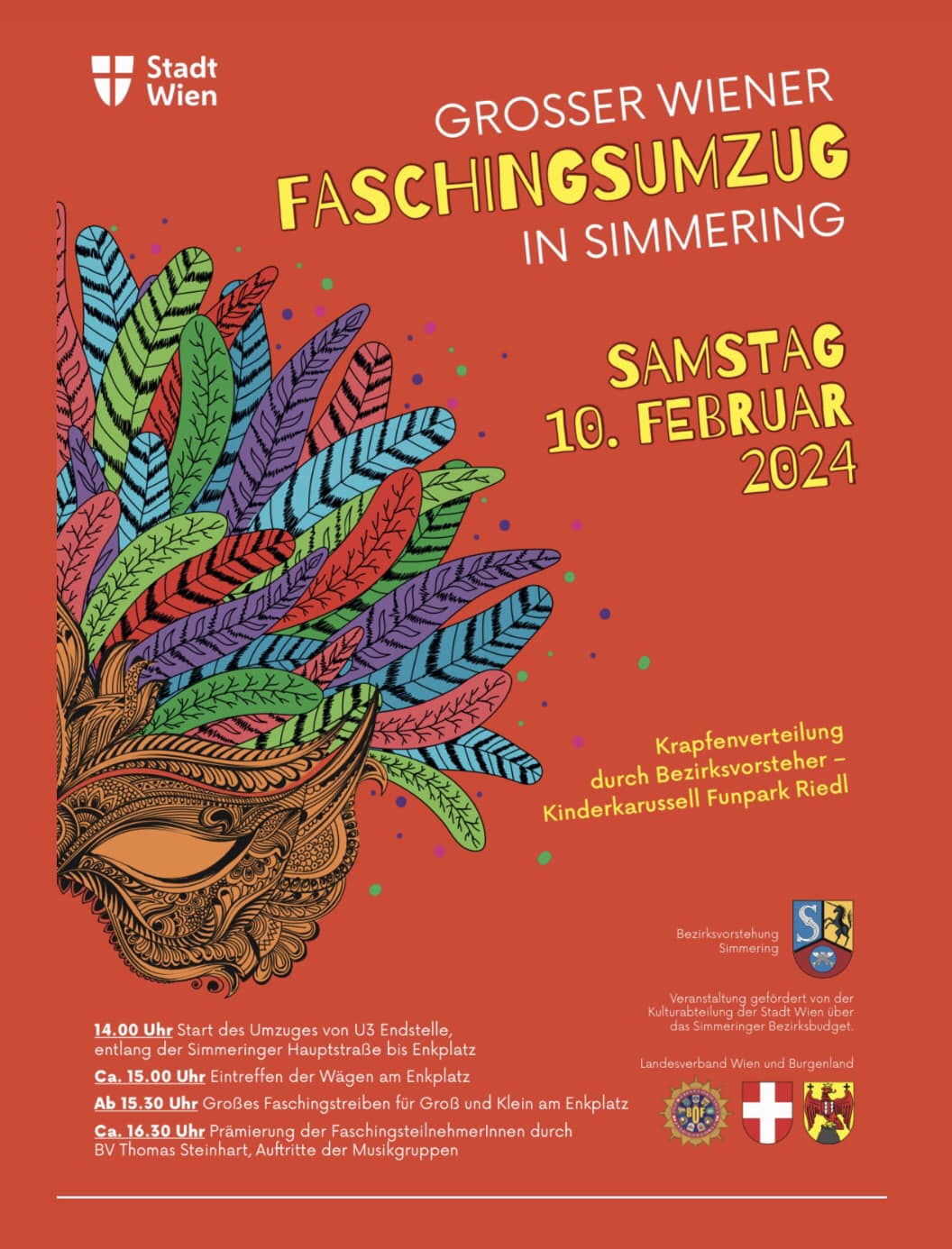 Kennt ihr schon den großen Wiener Faschingsumzug am Samstag, den 10. Februar 2024 in Simmering? Da müsst ihr unbedingt dabei sein! Es wird der absolute Knaller, versprochen!